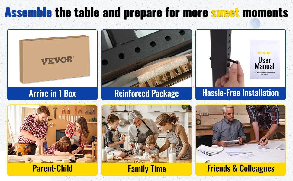 Are you ready to have a table that works for you? Stop bending over all day! Whether you stand or sit, the choice is yours. The VEVOR adjustable workbench is made of oak wood and cold-rolled steel, which are strong and have great wear resistance. We spayed an environmentally friendly transparent coating on the work table to ensure that our table can endure scratches and gain resistance to mold, easier cleaning, and longer service life. The spacious surface is perfect for handling a DIY project, crafting, home improvement, and more. Or, you can place the worktable in a bedroom or office as a computer desk or as a dining table in a dining room. Take back control of your space with VEVOR.