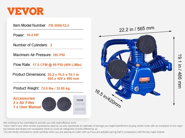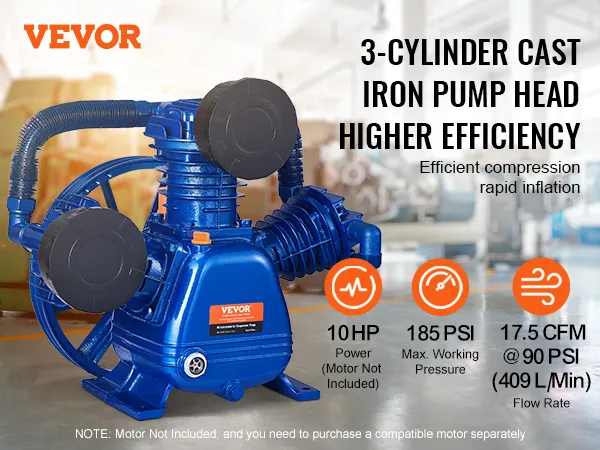 10HP Air Compressor Pump Head: VEVOR 10HP 3-cylinder air compressor pump head features 17.5 CFM @ 90 PSI flow rate, dual-stage compression and 185PSI max working pressure, provides a continuous and sufficient air supply for a wide range of equipment, ideal for tire inflation, spray painting, woodworking, and more tasks. (NOTE: Motor Not Included)