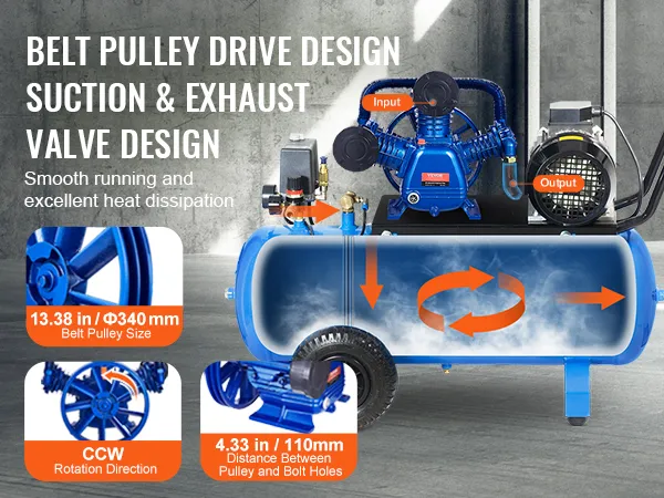 Proven Belt-Driven Design: Utilizing the proven belt-driven design to avoid bearing displacement, our dual-stage V type pump head provides excellent compression and smooth running. (Installation notes: When placing the pump head, the motor pulley and the belt pulley must be in the same straight line. The more aligned, the less vibration.)