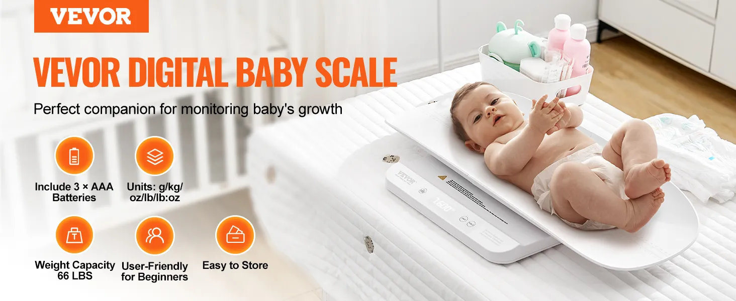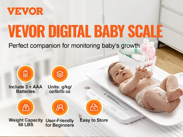 Spor din babys vægt ubesværet med VEVORs babyvægt med smart Bluetooth 4.0-funktion. Den aftagelige bakke kan nemt konverteres mellem en babyvægt og en småbørnsvægt, hvilket sikrer præcis vejning, uanset om din lille ligger ned eller står op.