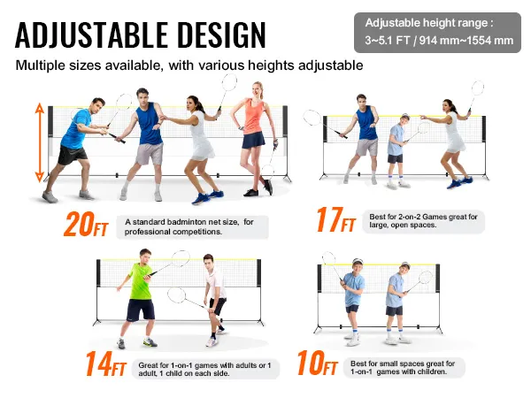 Divirta-se sem limites no quintal com nosso versátil conjunto de redes de treinamento. Com alturas ajustáveis de 90 cm a 1,55 m, você pode facilmente alternar a altura da rede entre alta e baixa, com configurações ainda mais baixas para pickleball, tênis e futebol de mesa.