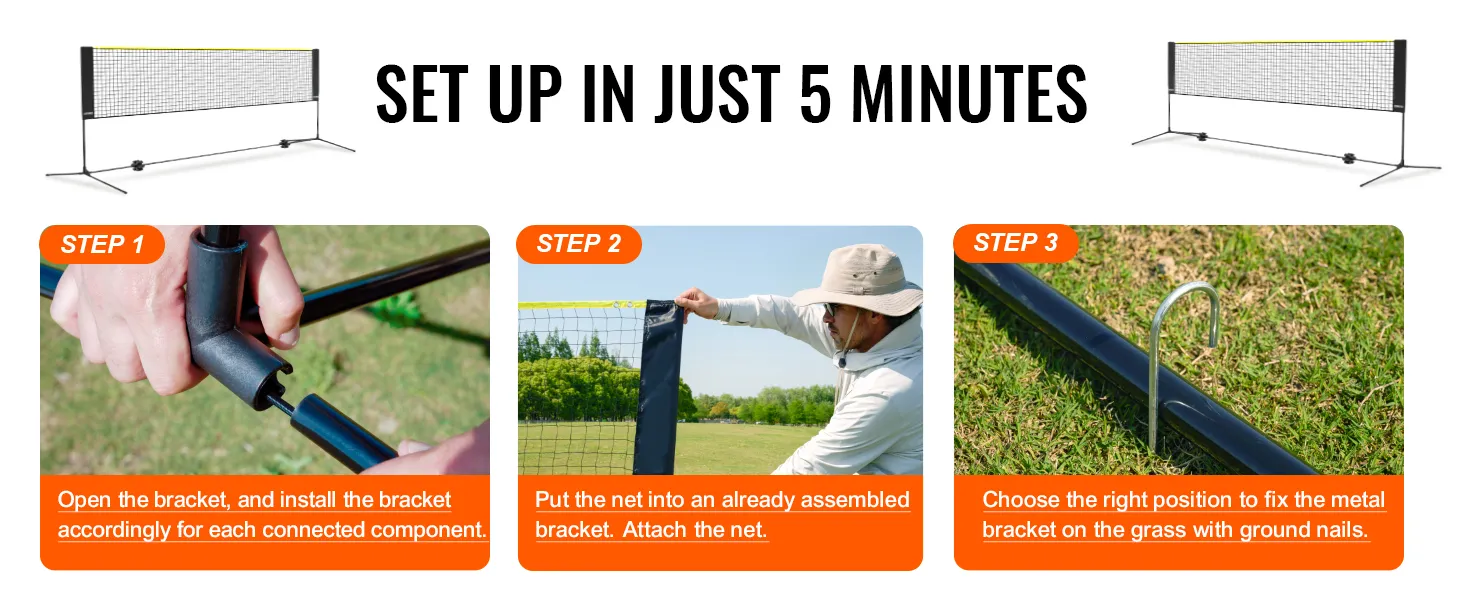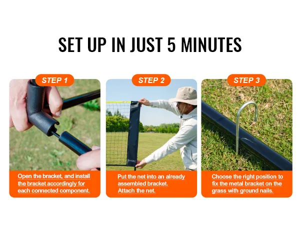Montagem rápida e fácil: Os postes são revestidos com tinta em pó para maior resistência à ferrugem e não requerem estacas ou ferramentas. Até as crianças podem ajudar na montagem, já que todas as peças são conectadas com cordas elásticas flexíveis, minimizando o risco de perda de peças e facilitando a montagem.