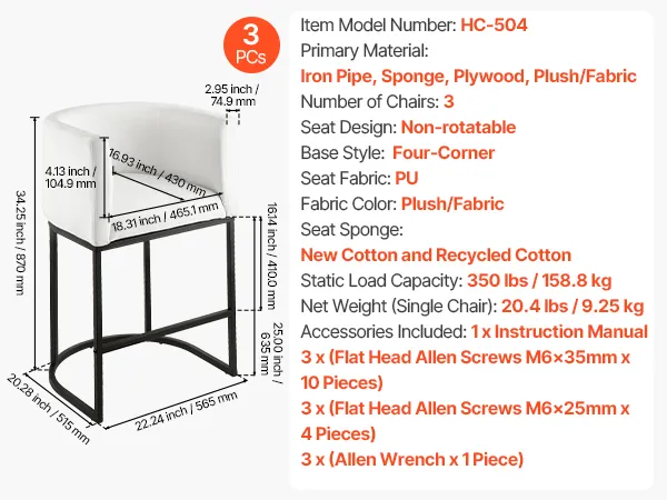 Practical Set: The set includes 3 bar stools, each measuring 22.24x20.28x34.25 inch, with a seat height of 25 in. This bar chair is ideal for larger families or open kitchen layouts, transitioning between dining, socializing, and office activities