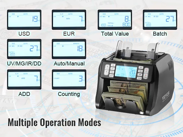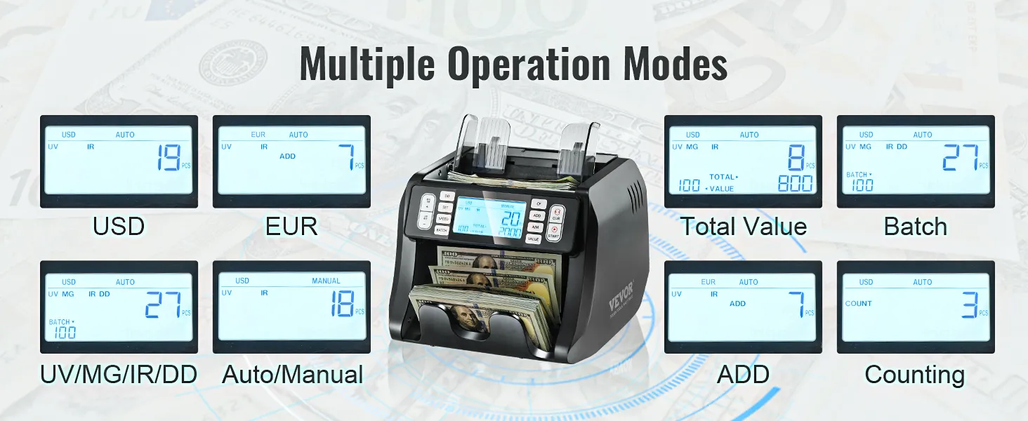 Díky čtyřem pokročilým metodám detekce a několika režimům počítání je počítačka bankovek VEVOR hračkou. Ať už provozujete malou firmu nebo velkou organizaci, počítačka hotovosti VEVOR je nepostradatelným nástrojem, který vám ušetří čas i peníze.