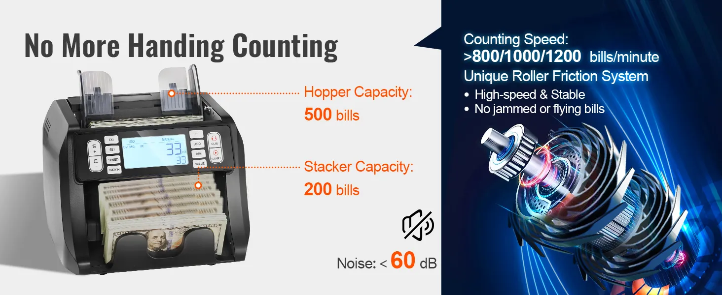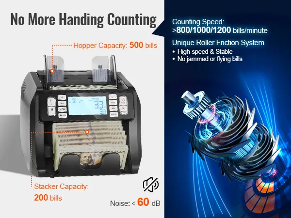 Šetřete si palec: Díky schopnosti počítat 1 200 bankovek za minutu a kapacitě zásobníku 500 kusů vám počítačka hotovosti pomůže spravovat tisíce dolarů v hotovosti v krátkém čase. Má také spolehlivý systém podávání, který zabraňuje zasekávání nebo odlétávání bankovek a zajišťuje tak plynulý proces počítání. Hladina hluku je navíc nižší než 60 dB. Díky rychlému a přesnému počítání můžete rychle a snadno provádět úkoly počítání hotovosti, a to i s velkým množstvím hotovosti.