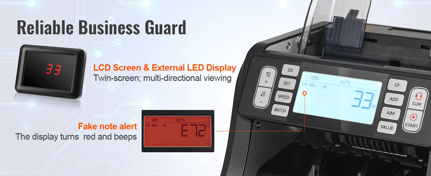 Duální displej: Počítačka peněz VEVOR je vybavena prémiovým LCD displejem a externím LED displejem a nabízí vám i vašim klientům jasný přehled o výsledcích počítání z různých úhlů. Při detekci padělaných bankovek se obrazovka navíc rozsvítí červeně a ozve se pípnutí, čímž se zajistí, že žádné falešné peníze nezůstanou bez povšimnutí.