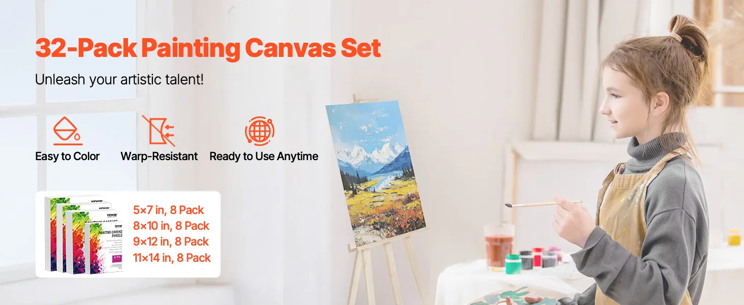 VEVOR plátna na malování, sada 32 bílých malířských pláten - 5x7, 8x10, 9x12, 11x14, malířské panely pro akrylové a olejové malby, akvarel, malířské plátno pro děti i profesionály
