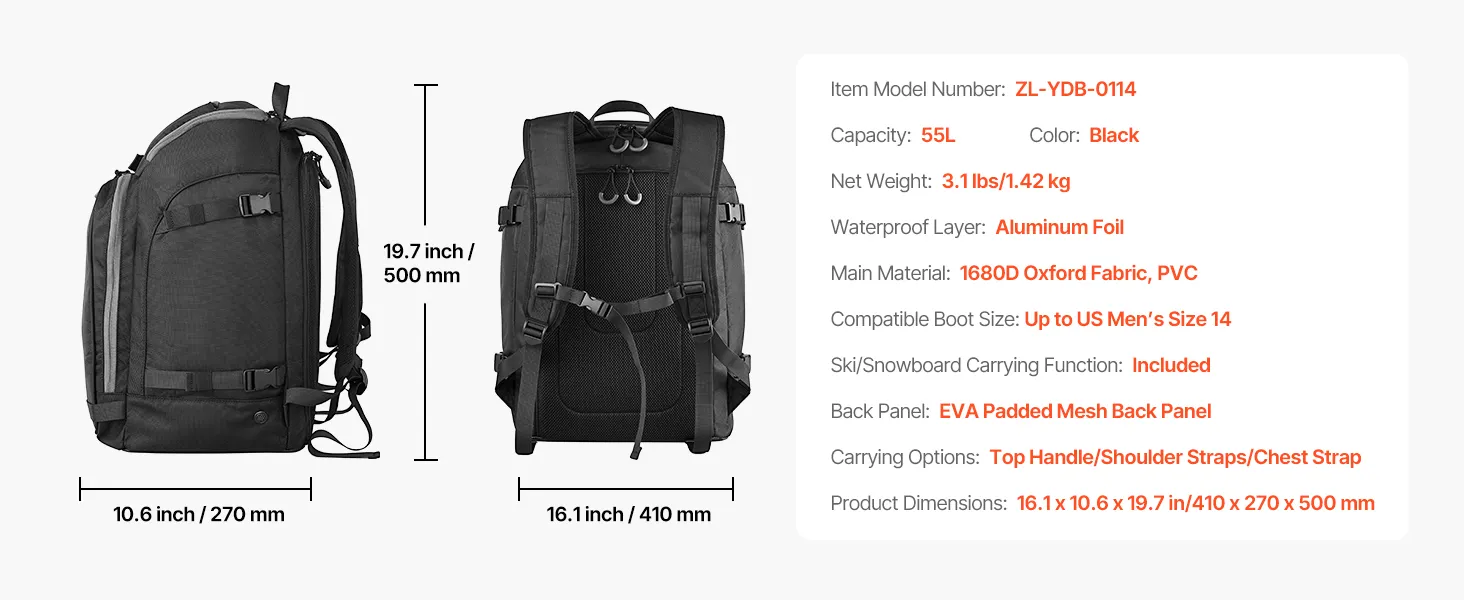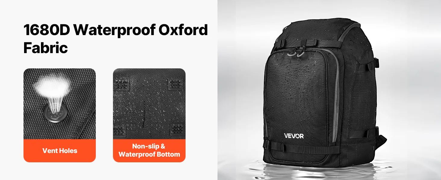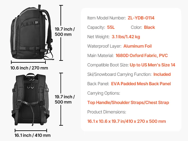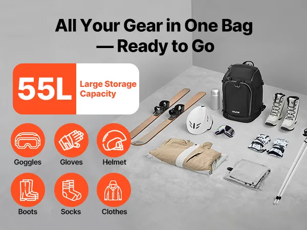 VEVOR Ski Boot Bag, 55L, Snowboard Boots Travel Backpack for Men Women, with Waterproof Exterior & Bottom, Durable 1680D Oxford, Bag for Skis, Snowboard, Helmet, Goggles, Gloves, Accessories (Black) VEVOR Ski Boot Bag, 55L, Snowboard Boots Travel Backpack for Men Women, with Waterproof Exterior & Bottom, Durable 1680D Oxford, Bag for Skis, Snowboard, Helmet, Goggles, Gloves, Accessories (Black)