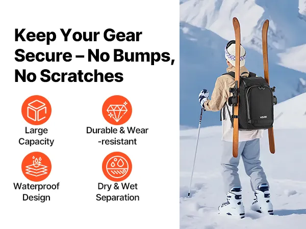 • Waterproof & Durable: Made with 1680D waterproof Oxford fabric, a rubberized bottom, and an aluminum foil waterproof layer, our ski boot backpack effectively blocks snow and rain to keep your gear dry and protected