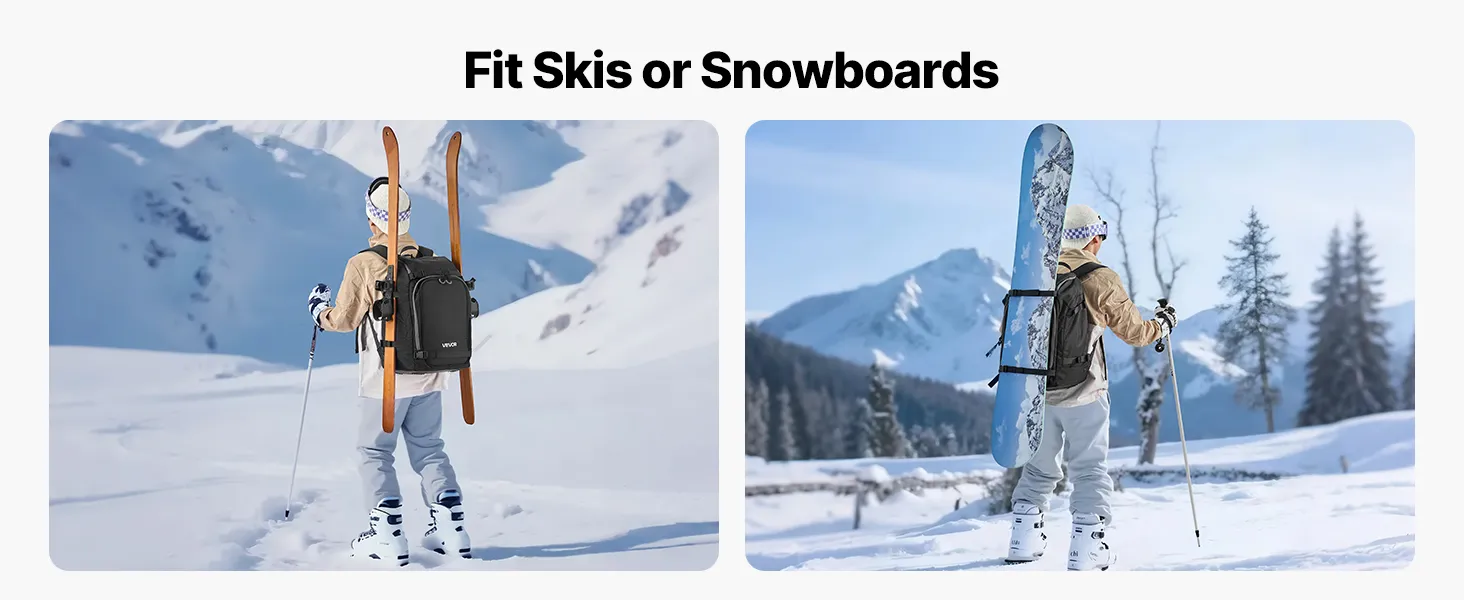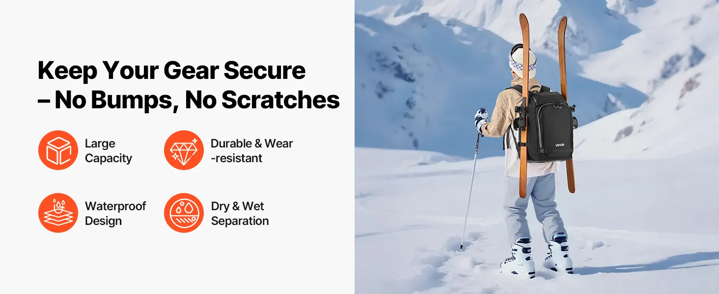 Our ski boot backpack fits snowboards and skis. Made of waterproof and wear-resistant Oxford fabric, with a standing mat and EVA-padded back panel, multiple compartments, it ensures organized storage and easy access. Fit boots and gear in one bag.