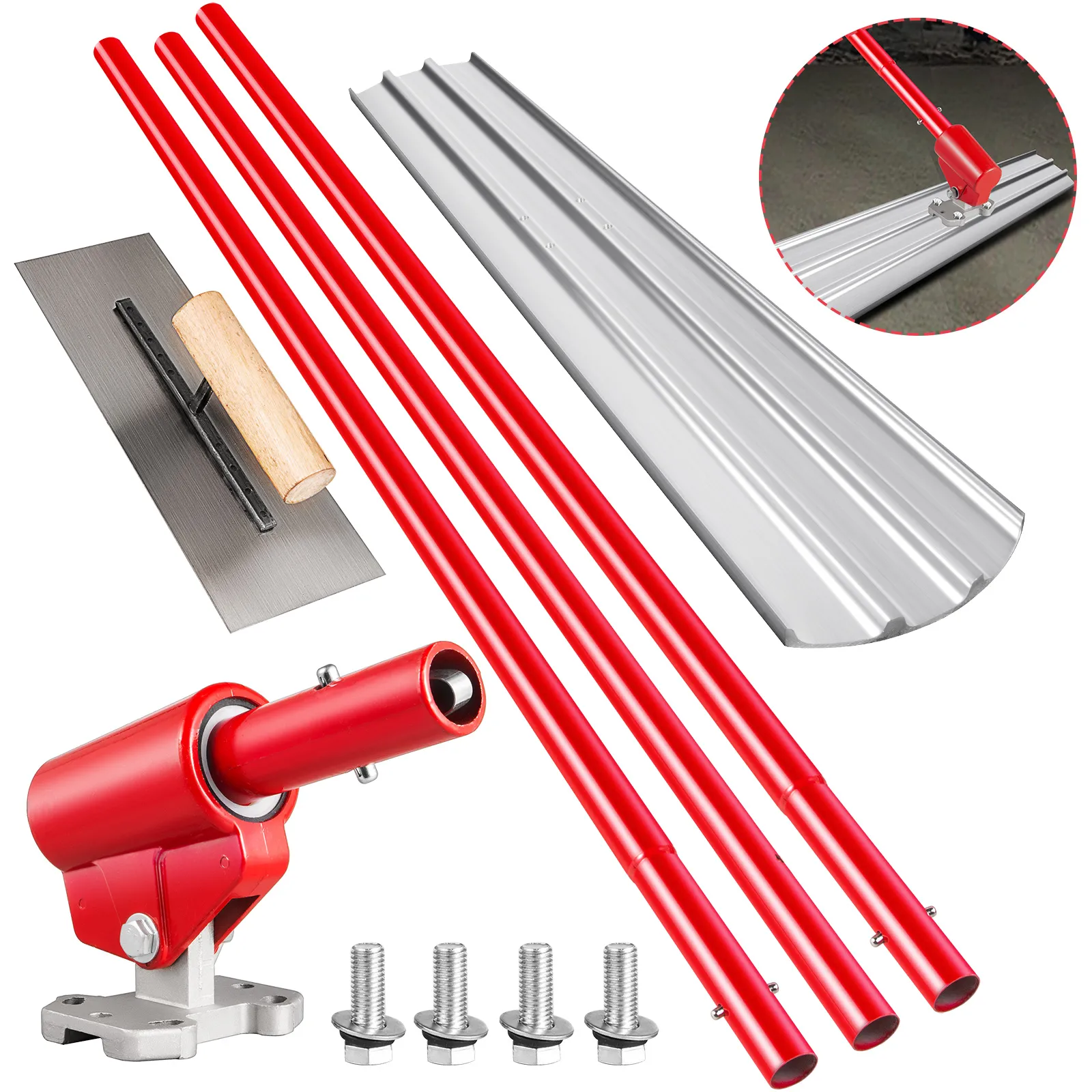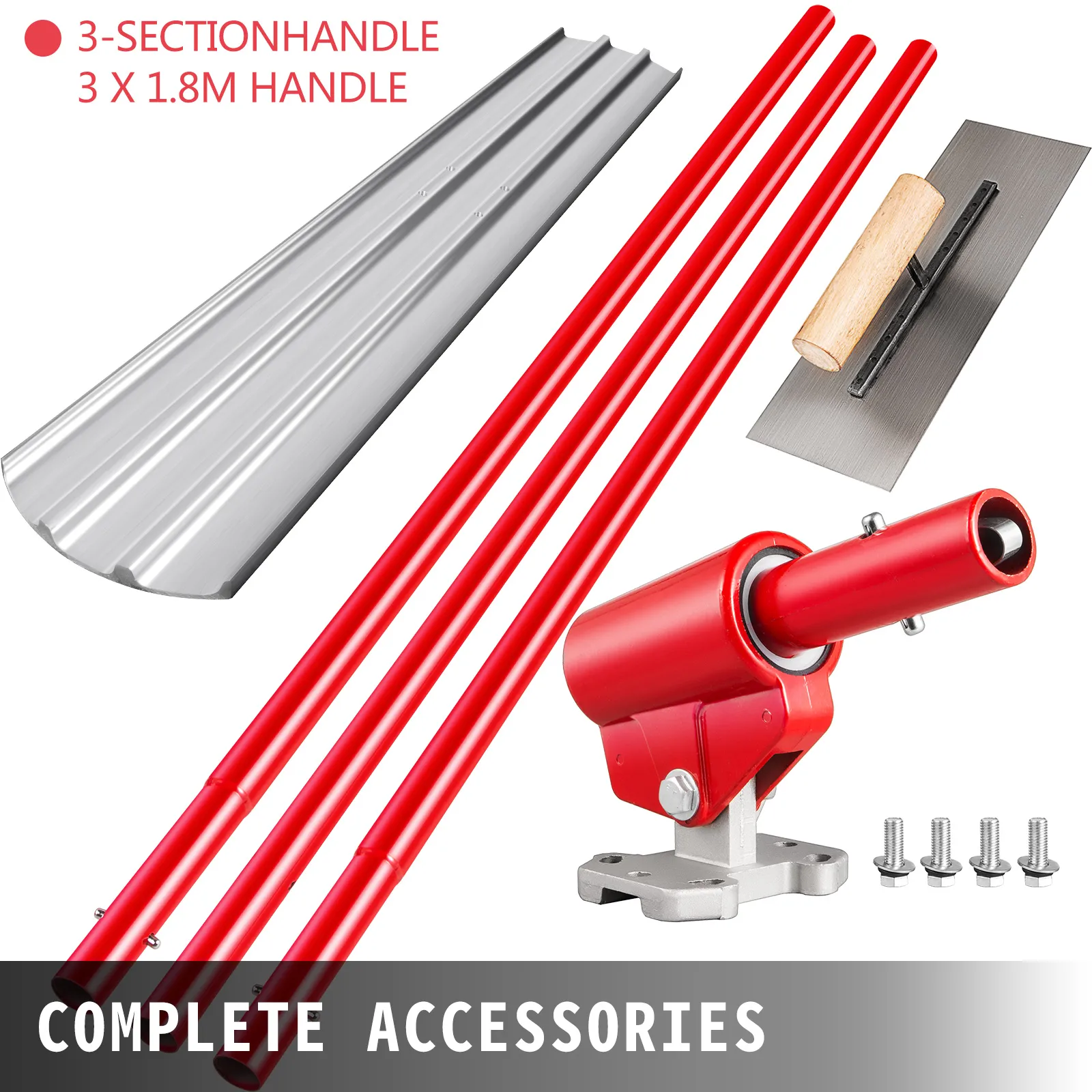 Bull float concrete kit consists of a finishing trowel, a bracket, four screws, a small trowel and three mounting handles. All accessories required for installation are included. The total length of the handle is 3x1.8 m.