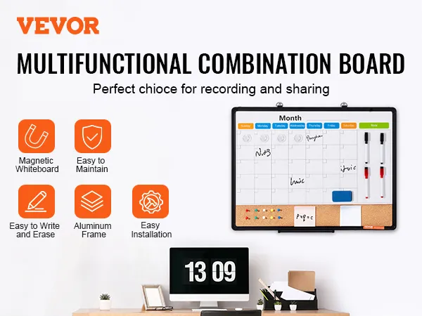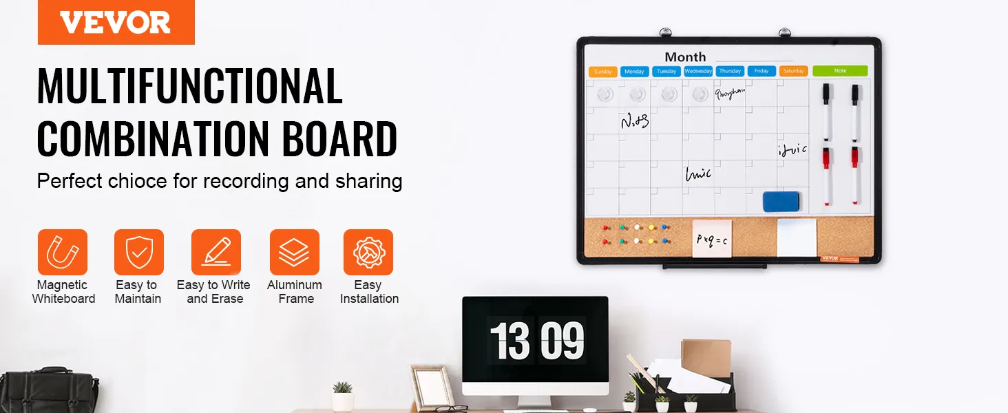 Kombinácia bielej a korkovej tabule VEVOR s mesačným kalendárom 24"x 18" s hliníkovým rámom – magnetická nástenka 2 v 1 s možnosťou suchého mazania na stenu – ideálna do školy, domácnosti a kancelárie