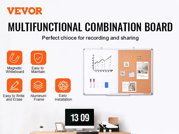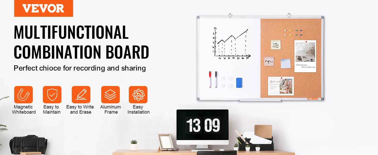 VEVOR 36" x 24" valkotaulu ja korkkitaulu, alumiinikehyksellä – 2-in-1 magneettinen kuivapyyhittävä ilmoitustaulu seinälle – ihanteellinen kouluun, kotiin ja toimistoon