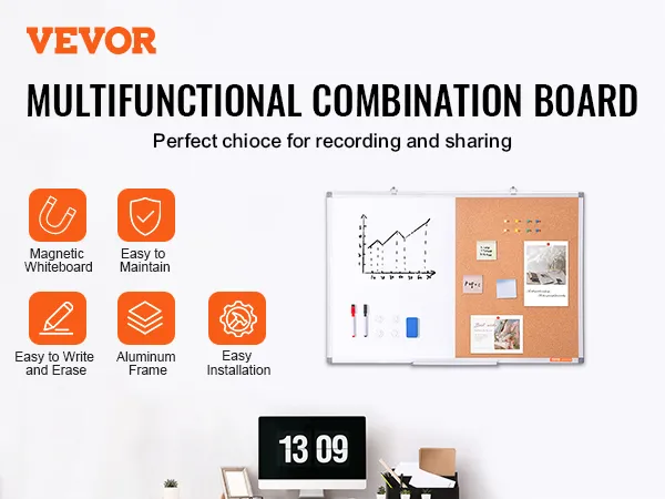 Monitoiminen yhdistelmätaulu: Yhdistelmätaulumme on kooltaan 48 x 36 tuumaa ja siinä on muistiinpano-osasto ja korkkialue. Tämä integroitu muotoilu auttaa sinua säilyttämään kaiken tarvitsemasi yhdessä paikassa. Korkkialue sopii erinomaisesti valokuvien, muistiinpanojen ja muiden asiakirjojen kiinnittämiseen, kun taas muistiinpano-osasto on täydellinen tärkeiden viestien ja työmuistutusten kirjoittamiseen. Se on ihanteellinen valinta päivittäisten tehtävien hallintaan ja ongelmien tehokkaaseen ratkaisemiseen.