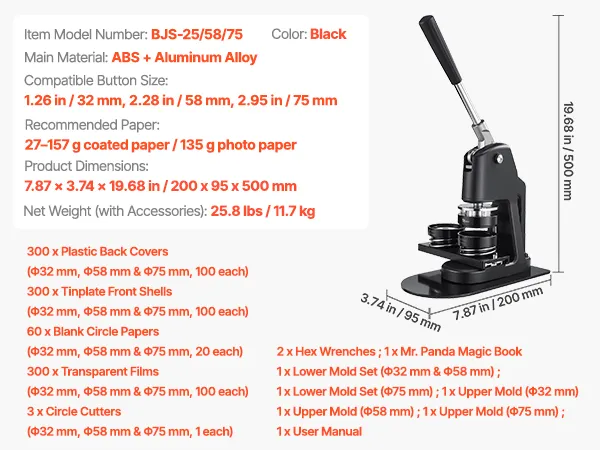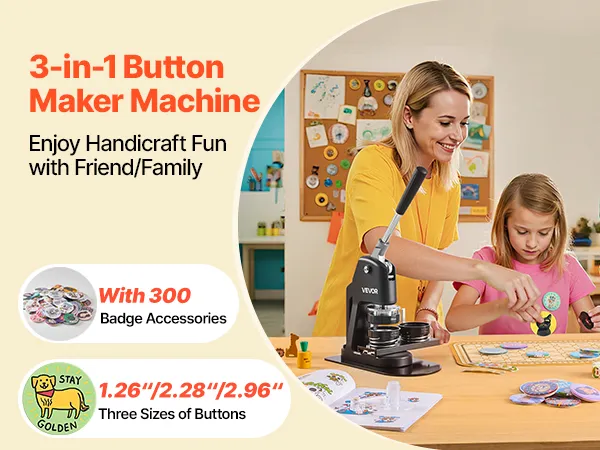 VEVOR Button Maker Machine, 32/58/75 mm 3-in-1, Plastic Pin Maker with 300pcs Button Parts, Circle Cutter and Magic Book, Reinforced Ergonomic Handle, for DIY Badges, Personalized Pins, Black
