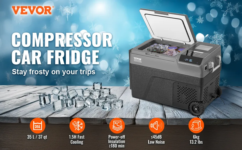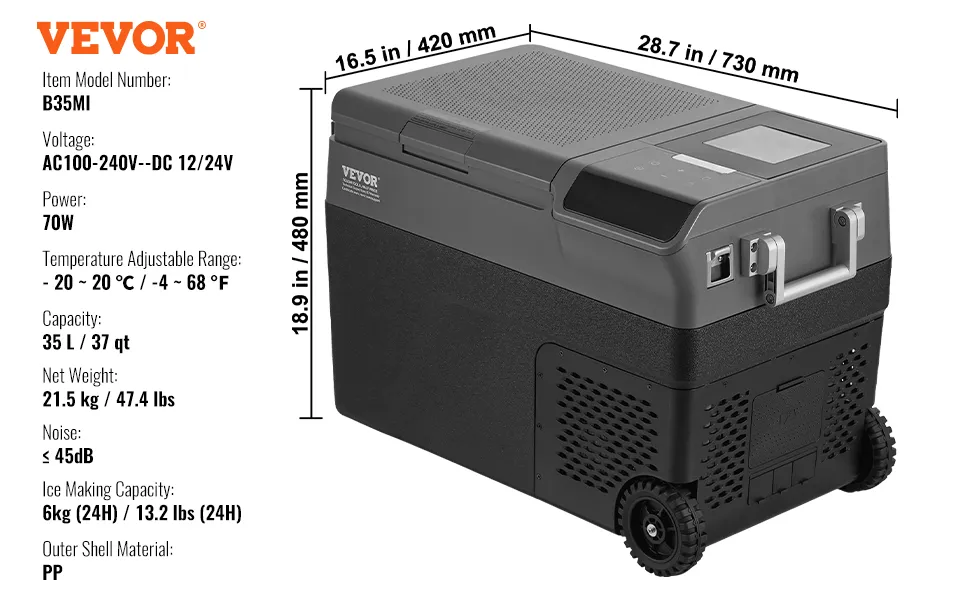 The 35 L car refrigerator features an upgraded compressor for rapid cooling in just 1.5 hours. It includes an ice-making function that produces 6 kg / 13.2 lbs of ice daily and performs well across a wide temperature range from 16 to 38°C / 60.8 to 100.4°F.