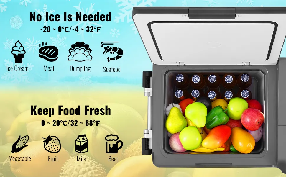 Powerful Capacity: The portable refrigerator/freezer features a single compartment with a 35 L capacity. This robust RV fridge can hold 60 cans of 330ml cola or 30 bottles of 550ml water or 12 bottles of 750ml wine, and is ideal for storing seafood, snacks, meats, and beverages. It meets the needs for short trips, boating, and camping.