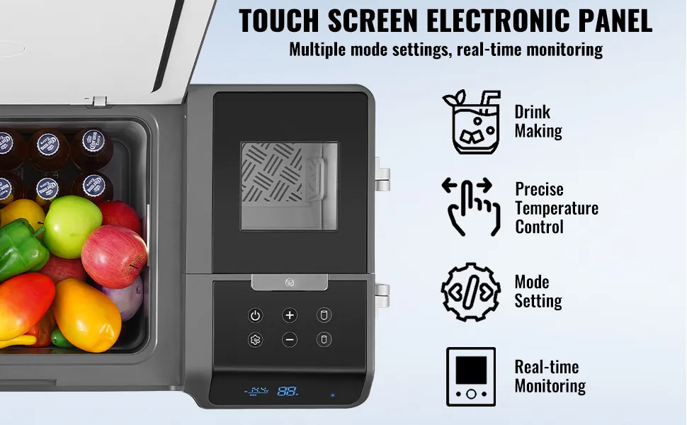 Ice-Making Function: Equipped with an ice-making feature, this car fridge can produce 6 kg / 13.2 lbs of ice per day, providing fresh ice wherever you go. The touch control panel allows you to monitor the fridge’s status and adjust the temperature range, with settings from -20 to 20°C / -4 to 68°F.