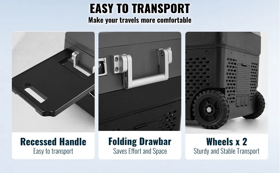 Equipped with two wheels and a foldable handle, this car fridge offers a sturdy and stable transport structure, making travel and transport effortless. The built-in light illuminates the interior space when the lid is opened, making it easy to select your items.