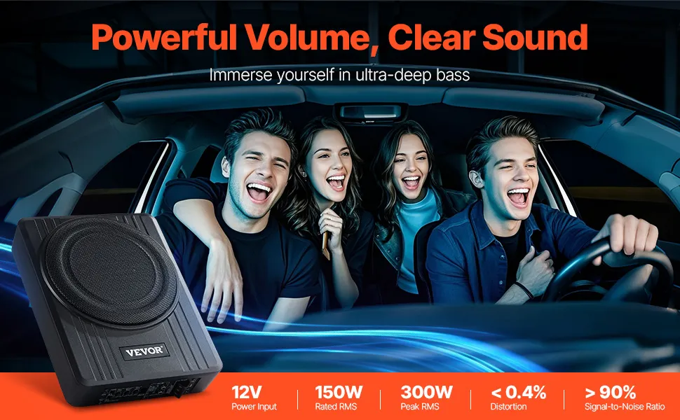 Stable with High Fidelity: With 150W RMS rated power and 300W RMS peak power, our 10" powered car audio subwoofer delivers a distortion rate below 0.4% and a signal-to-noise ratio greater than 90%. It maintains clear, accurate sound even at high volumes, minimizes background noise, and prevents speaker damage, creating an immersive audio experience.