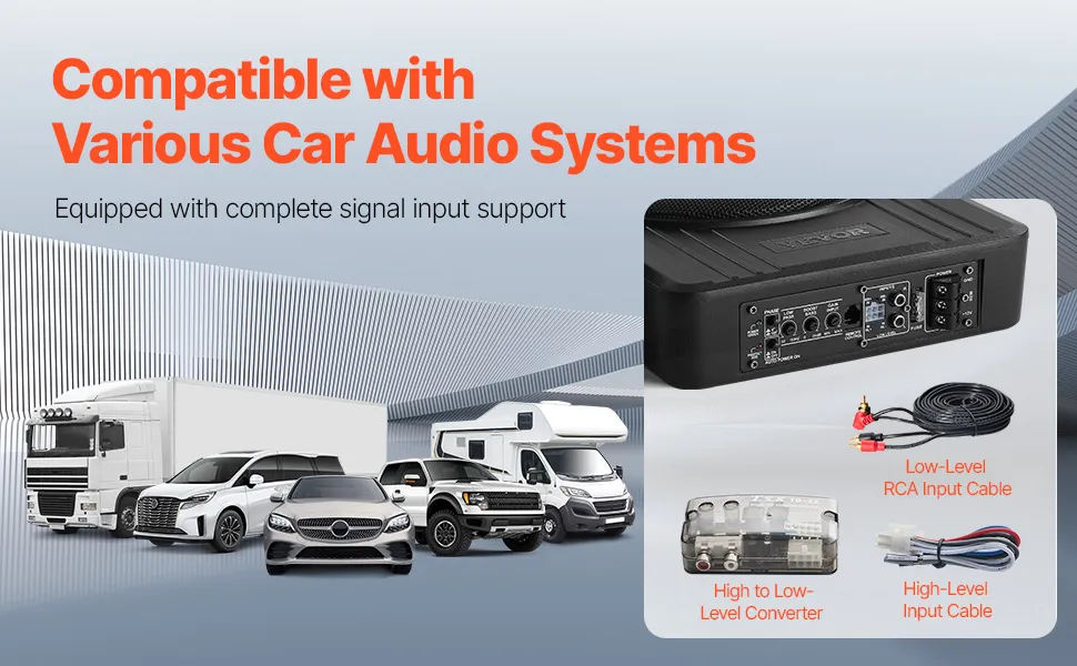 Compatible with all vehicle types—cars, SUVs, trucks, and RVs—this subwoofer seamlessly integrates with your audio system using the RCA audio cable or high-level input cable, offering impeccable matches with both high-end and simplified main units.
