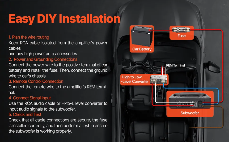 Highly Compatible: This under seat car truck subwoofer offers multiple signal input options, supporting both low-level RCA inputs and high-level inputs. It also includes a high-to-low level converter, ensuring compatibility with a wide range of car audio system, whether or not the main unit is equipped with RCA output.
