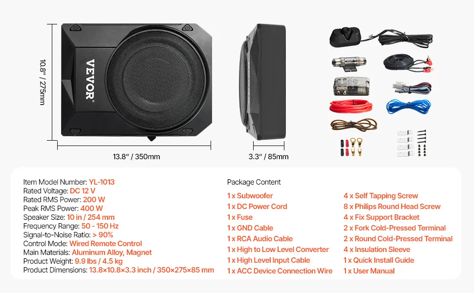 This 10" under-seat car subwoofer is a must-have for car audio enthusiasts, delivering powerful bass and clear sound while saving space with its slim 3.3" profile. Equipped with high/low level input and a maximum output of 400W, it greatly elevates your audio experience to next level.