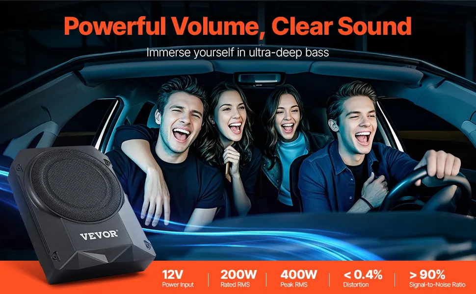 Stable with High Fidelity: With 200W RMS rated power and 400W RMS peak power, our 10" powered car audio subwoofer delivers a distortion rate below 0.4% and a signal-to-noise ratio greater than 90%. It maintains clear, accurate sound even at high volumes, minimizes background noise, and prevents speaker damage, creating an immersive audio experience.