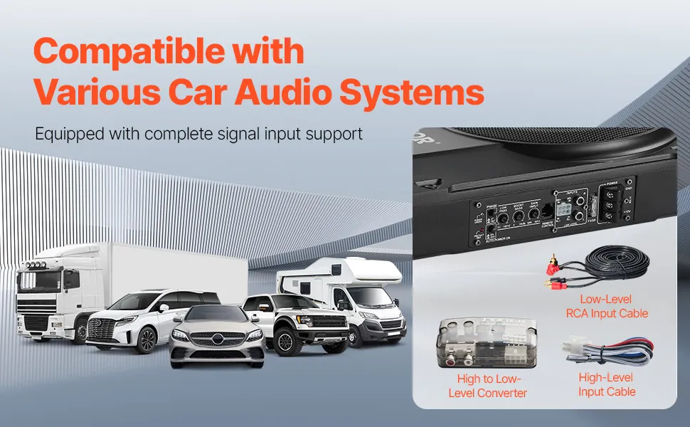 Compatible with all vehicle types—cars, SUVs, trucks, and RVs—this subwoofer seamlessly integrates with your audio system using the RCA audio cable or high-level input cable, offering impeccable matches with both high-end and simplified main units.