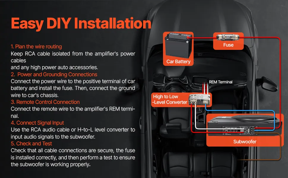 Highly Compatible: This under seat car truck subwoofer offers multiple signal input options, supporting both low-level RCA inputs and high-level inputs. It also includes a high-to-low level converter, ensuring compatibility with a wide range of car audio system, whether or not the main unit is equipped with RCA output.