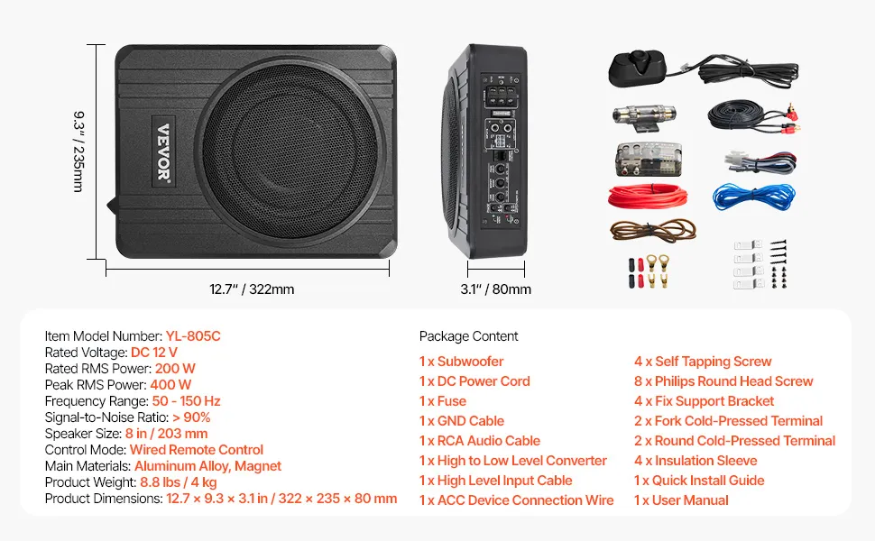 This 8" under-seat car subwoofer is a must-have for car audio enthusiasts, delivering powerful bass and clear sound while saving space with its slim 3.1" profile. Equipped with high/low level input and a maximum output of 400W, it greatly elevates your audio experience to next level.