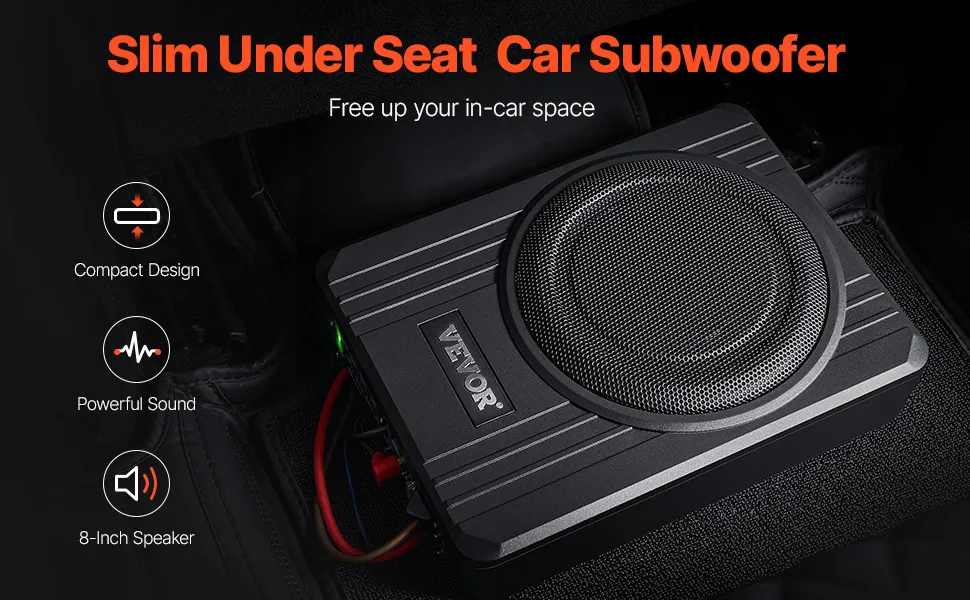 VEVOR 8" 400W Underseat Car Subwoofer, Slim Powered Car Subwoofers Under the Seat, Low Profile Audio Sub Built-in Amplifier, High/Low Level Input & Volume Controller for SUVs, Car, Truck, RV