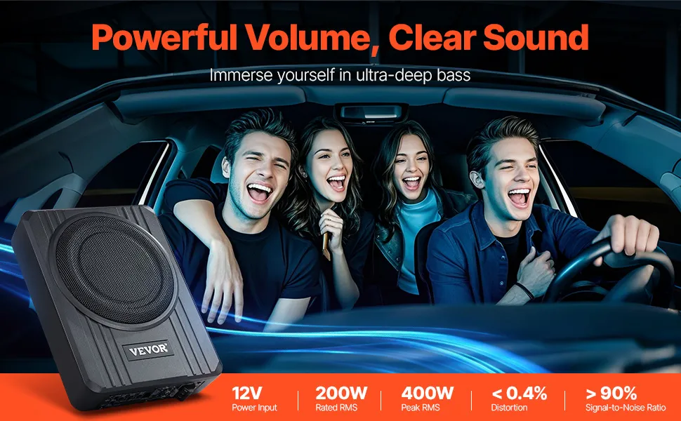 Stable with High Fidelity: With 200W RMS rated power and 400W RMS peak power, our 8" powered car audio subwoofer delivers a distortion rate below 0.4% and a signal-to-noise ratio greater than 90%. It maintains clear, accurate sound even at high volumes, minimizes background noise, and prevents speaker damage, creating an immersive audio experience.