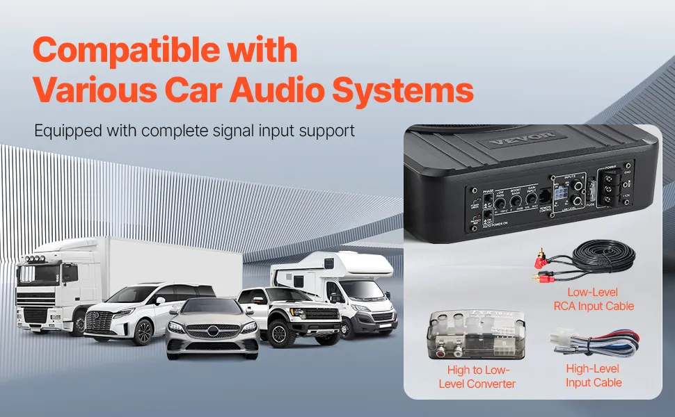 Compatible with all vehicle types—cars, SUVs, trucks, and RVs—this subwoofer seamlessly integrates with your audio system using the RCA audio cable or high-level input cable, offering impeccable matches with both high-end and simplified main units.