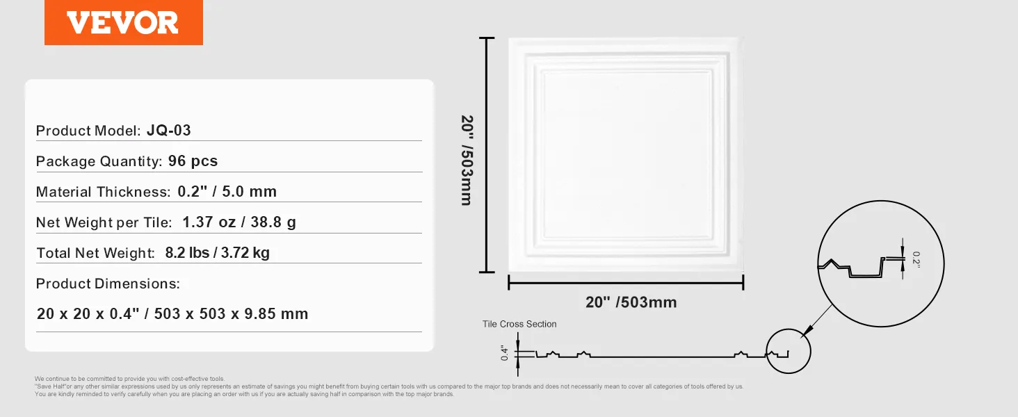 Stropní dlaždice 20”: Tyto čtvercové stropní dlaždice měří 20”x20”, celkem 96 kusů pokrývají 267 čtverečních stop. Rozlučte se se starými, špinavými stropy a osvěžte svůj prostor.