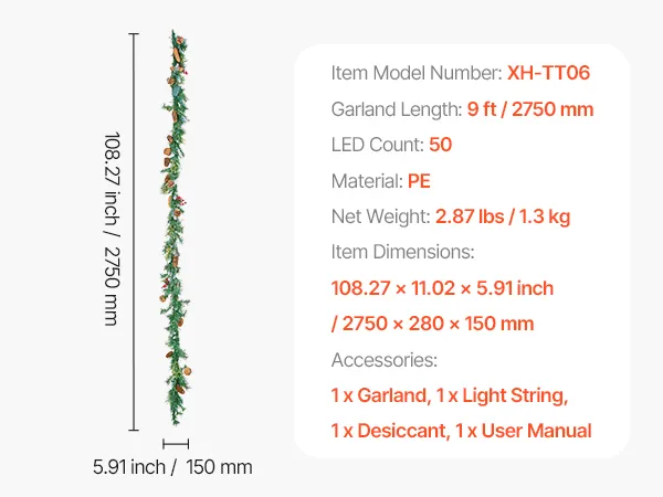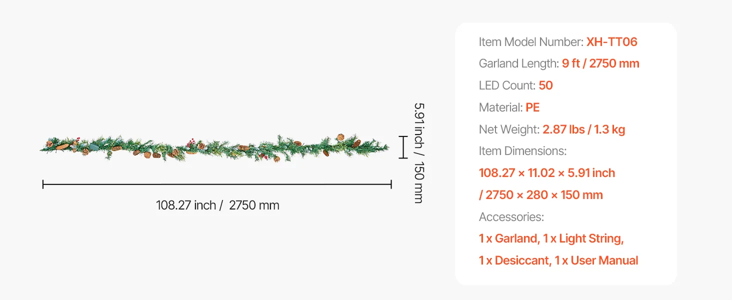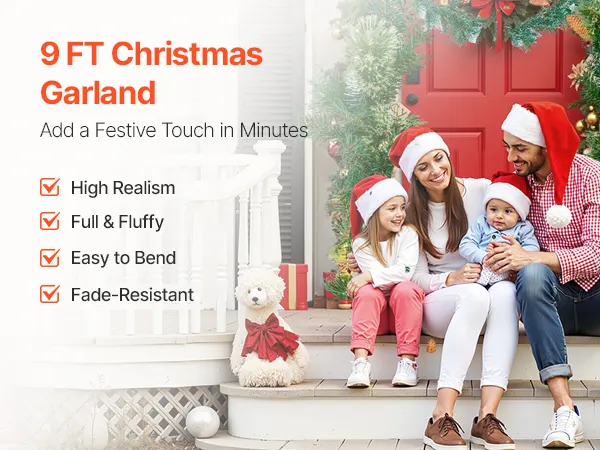 • Size & Design: This 9-foot Christmas garland features a realistic mix of pine needles, 4 round pine cones, 9 long pine cones, and 4 berry clusters, creating a full, lifelike look that brings the beauty of nature into your home