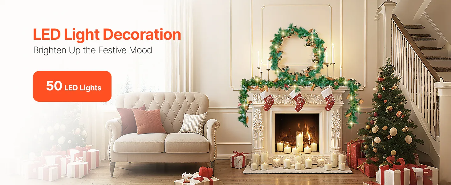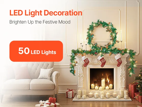 • Includes LED Lights: Equipped with 50 warm white LED lights, this greenery garland gives off a cozy glow at night, adding a magical touch to your decor and enhancing the holiday atmosphere. Requires 3 AA batteries (not included)
