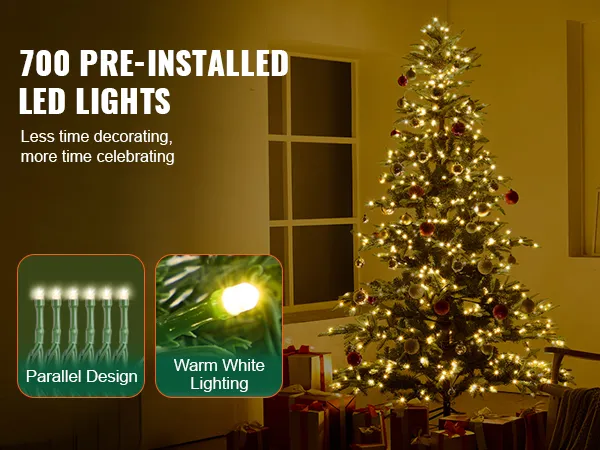 Varmvita LED-lampor: Njut av 700 varmvita LED-lampor som redan är upphängda på granen, vilket sparar värdefull tid för dekoration. Designad med parallell belysning, även om en LED-lampa slocknar, kommer resten att förbli tända och lysa upp din underbara julkväll!