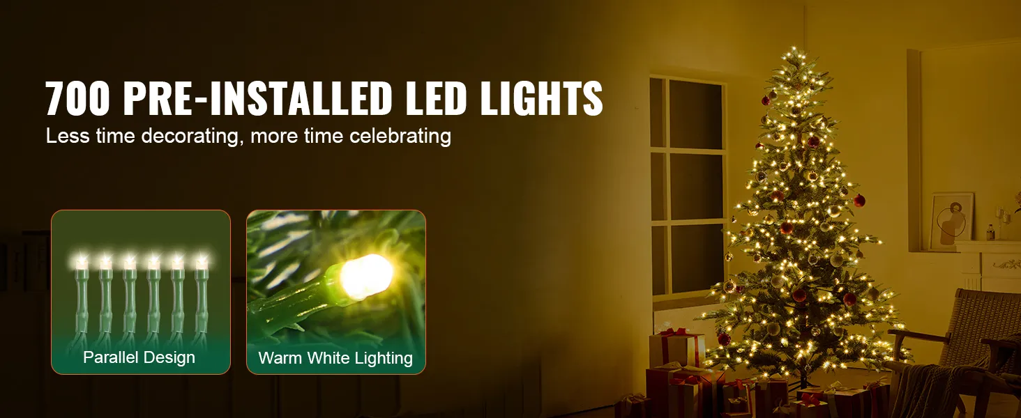 Njut av bekvämligheten med 700 varmvita LED-lampor som är förupphängda på granen, vilket sparar värdefull tid under dekorationen. Utformad med parallell belysning, även om en glödlampa slocknar, kommer de andra att förbli tända, vilket skapar en magisk julstämning.