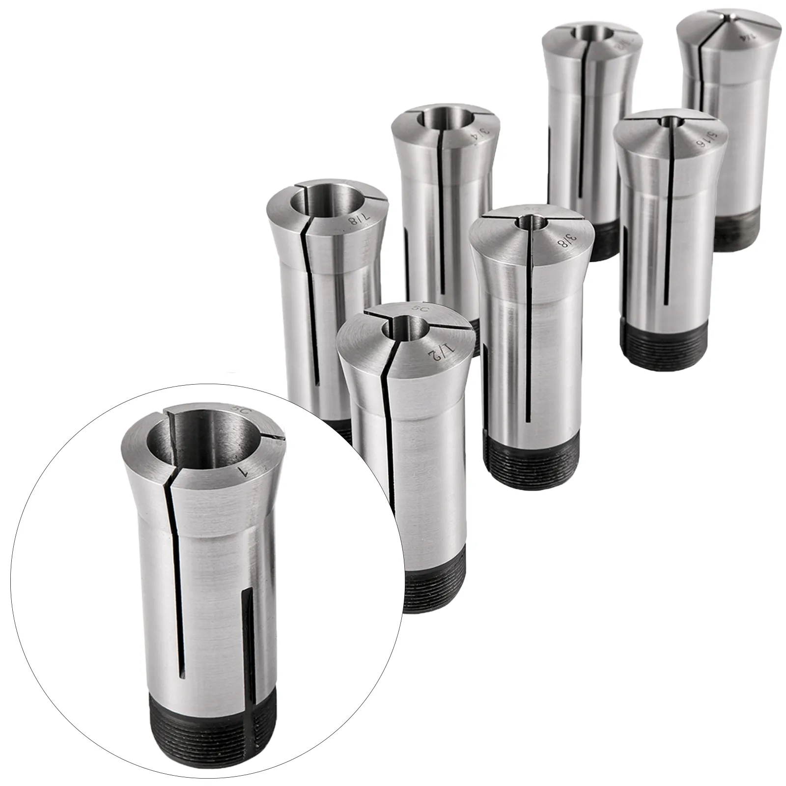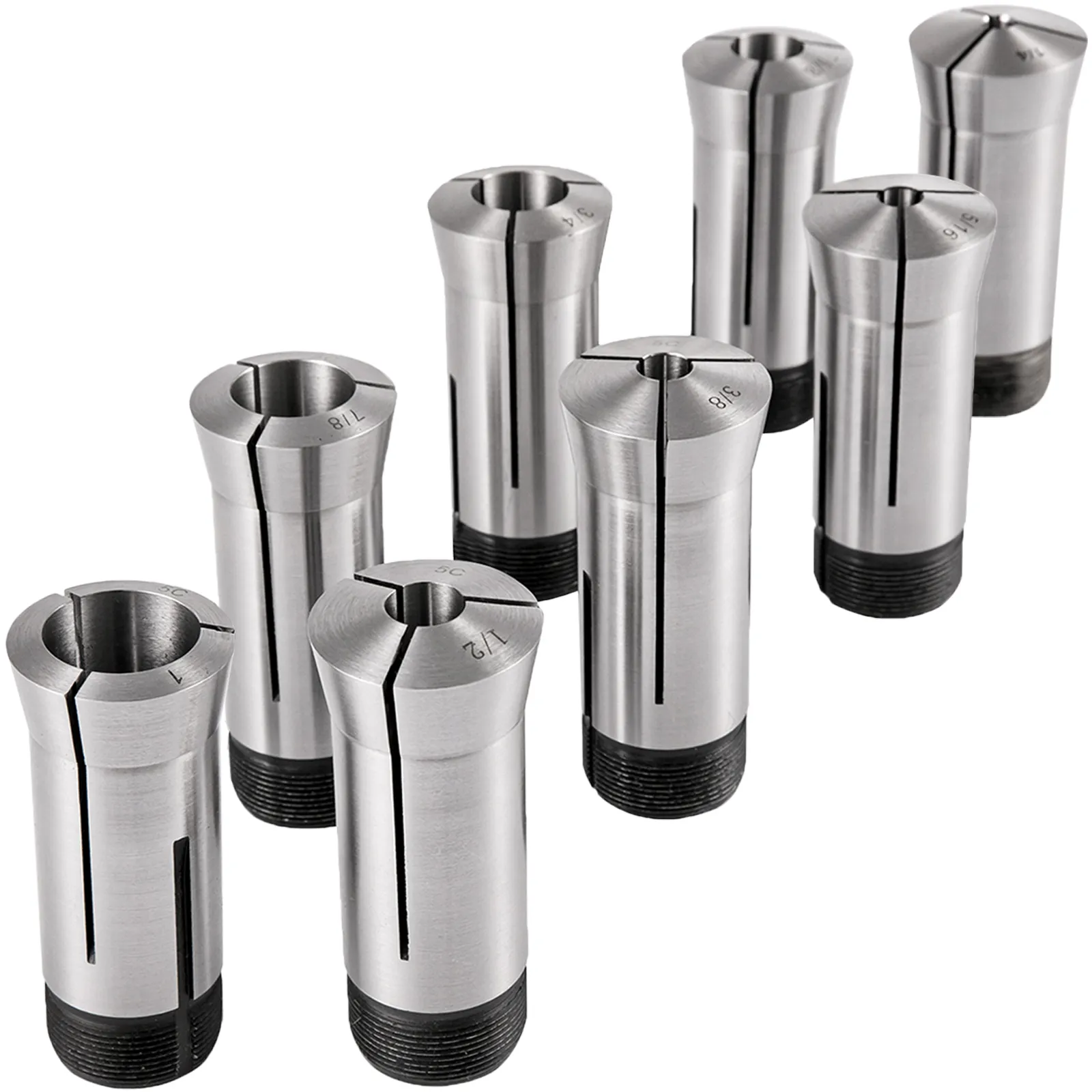 【8 PCS IN TOTAL】 - Size: 1/4", 5/16", 3/8", 1/2", 5/8", 3/4", 7/8" (6.35, 7.94, 9.53, 12.7, 15.88, 19.05, 22.23 mm). The lathe collet set contains 7 pieces of collets and an extra one of φ0.98" (25 mm) aperture.