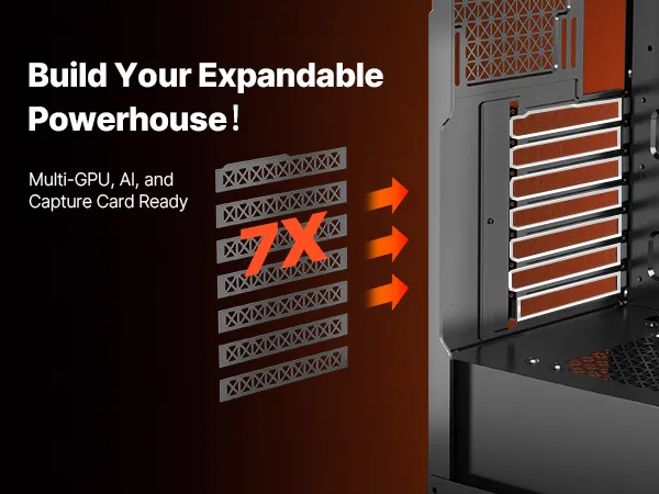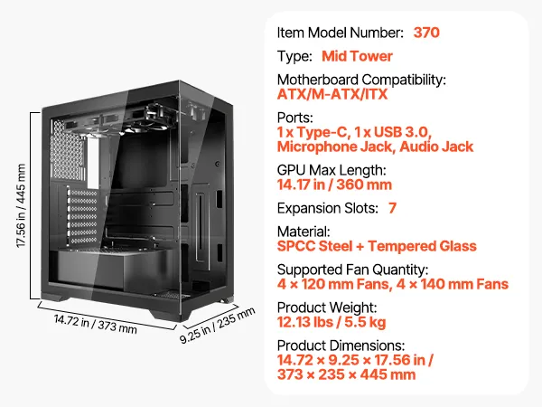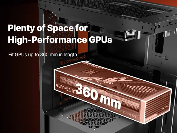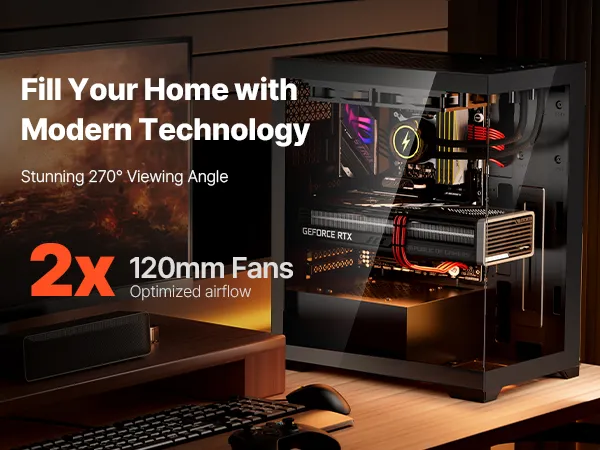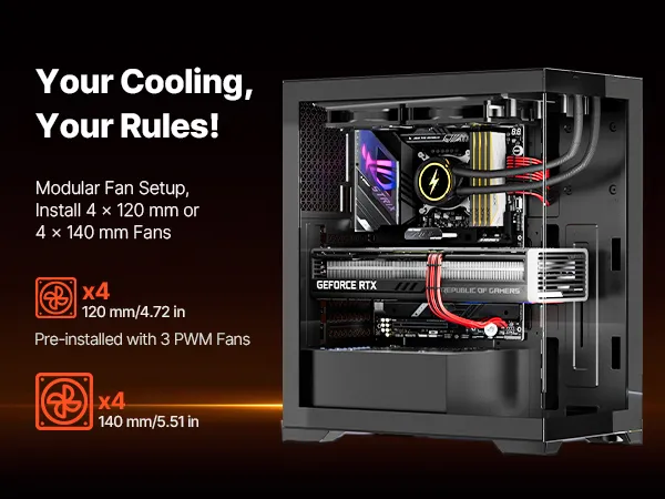 Vertical Airflow Cooling: Equipped with 2 x 120 mm fans, the PC case supports up to 4 x 120 mm (4.72 in) or 4 x 140 mm (5.51 in) fans, ensuring exceptional cooling efficiency. Keep your system at optimal temperatures during intense gaming sessions and avoid overheating
