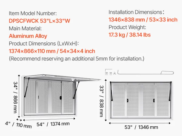 Q1: Are the window dimensions precise? Will it fit my food cart/counter?A1: Strict size control! The window frame installation size is 1346x838 mm / 53x33 inch, suitable for standard food cart/counter openings. Please measure your installation space before purchasing.Q2: Is the aluminum composite panel prone to cracking or scratching?A2: Highly durable! The upgraded 2.5mm aluminum composite panel is sturdy and impact-resistant, outperforming ordinary materials and able to endure bumps, high heat, and oily environments.Q3: Can the hydraulic rods stably support an 85° opening angle?A3: Dual hydraulic rods provide strong support! Using 420 series hydraulic rods (150mm stroke), the window opens and closes smoothly and can stay suspended at any angle—ideal for frequent use scenarios.Q4: Are the locking points prone to rusting?A4: Galvanized anti-rust treatment! Locking points feature a zinc alloy coating and pass a 72-hour salt spray test, offering better rust resistance than ordinary locks for long-term outdoor use without worry.Q5: Does it include a screen? How do I clean it?A5: Designed for easy maintenance! This version includes a screen to effectively keep out insects. The window surface can be cleaned with a damp cloth. The frame has a white powder-coated finish that resists oil stains.