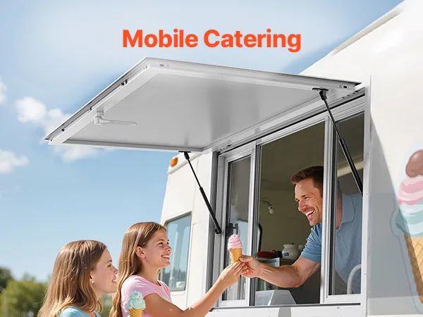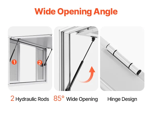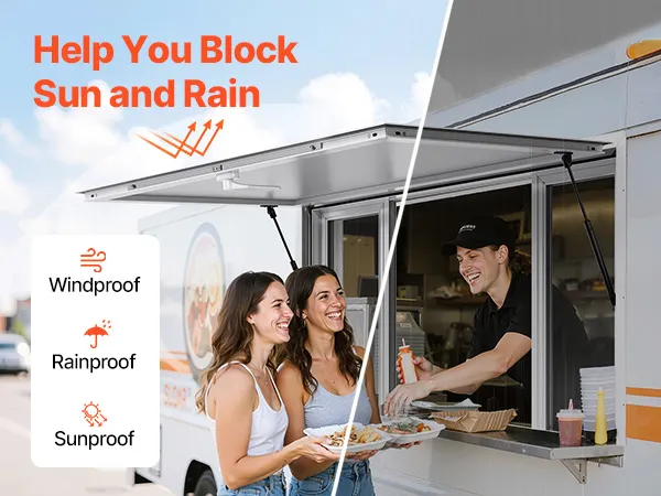 Easy to Open: With an 85° wide opening angle and a clear view, the concession truck window is equipped with two hydraulic rods for opening. The included awning guards against heavy rain, sun, and theft, enabling you to serve customers with ease