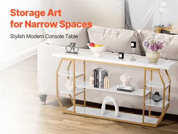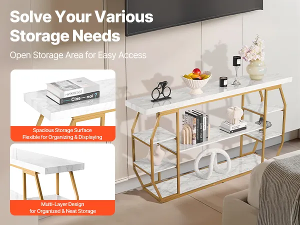 VEVOR Marble Console Table, 3 Tiers Modern Console Table for Open Storage, Golden Geometric Table with Iron Tubes, Anti-Tip Device and Triangular Support for Living Room, Hallway, Entryway, Foyer