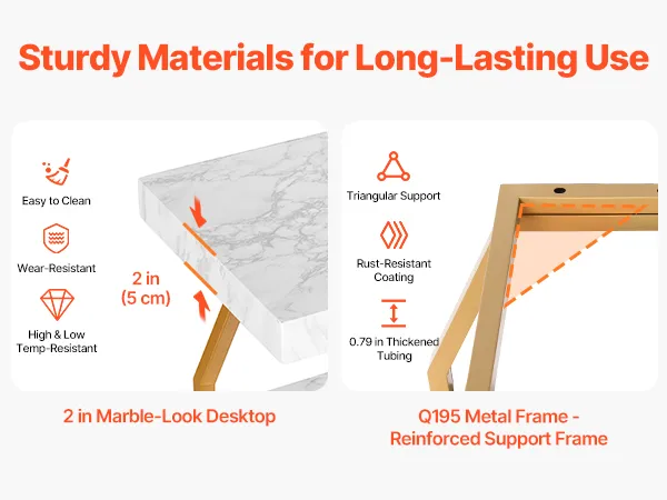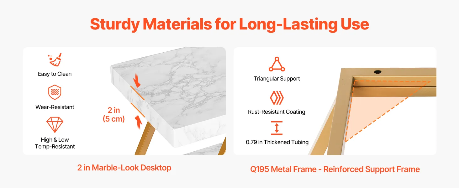 Crafted with a Q195 metal frame, this table supports up to 220 lbs / 100 kg, ensuring stability without wobbling. The faux marble tabletop is wear-resistant and built to last.