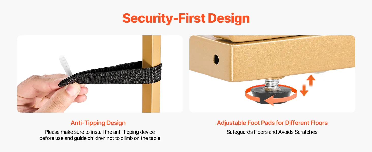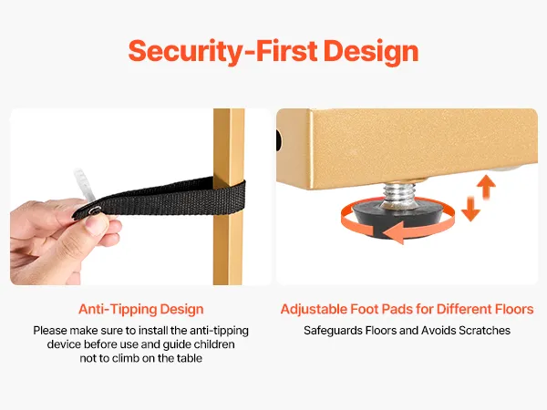 Thoughtful Details: Adjustable foot pads adapt to uneven floors, ensuring the table stays steady and preventing wobbling, while also protecting your floors from scratches. The anti-tip device adds extra security—be sure to install it for enhanced stability.
