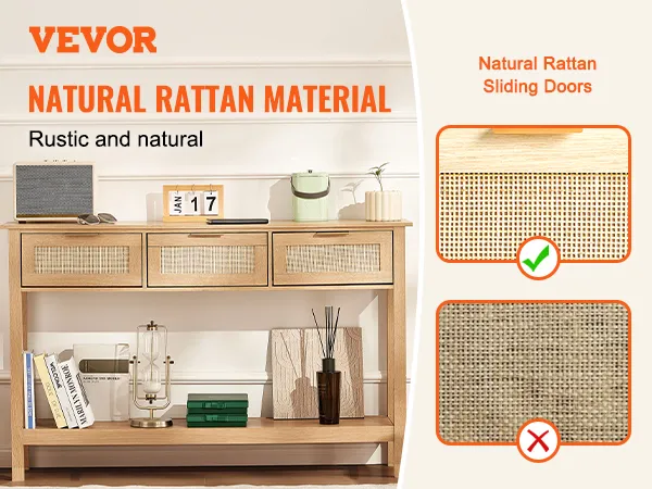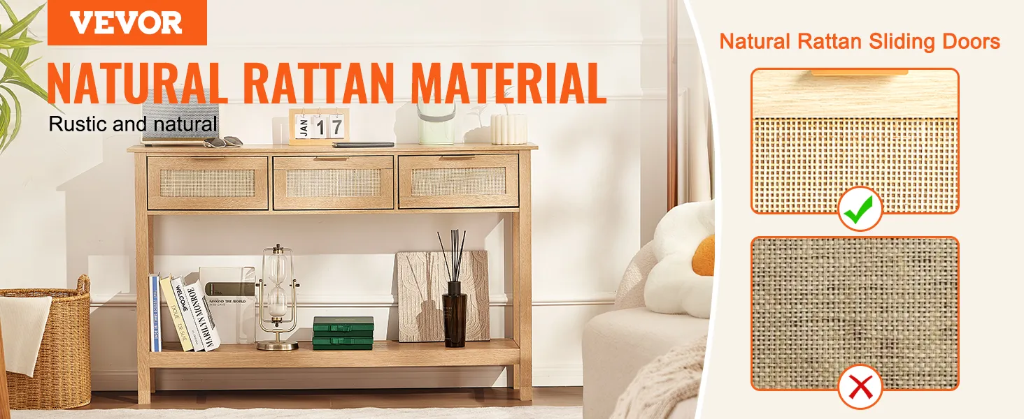Konzolový stolek VEVOR z ratanu se 3 úložnými zásuvkami, ratanový předsíňový stolek s posuvnými dveřmi z přírodního ratanu, konzolový stolek s rozkládací pohovkou do obývacího pokoje, pracovny, předsíně nebo televizní stěny, přírodní
