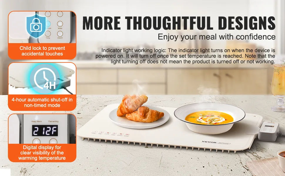 Keep Warm for a Long Time: With a spacious 23.62 x 15.75 inch surface, this electric warming tray uses metal heating wires at the bottom to provide continuous, even heat for up to 12 hours, keeping your food warm so you can enjoy warm meals at any time. The indicator light turns on when powered and turns off once the desired temperature is reached. Note: The light turning off does not mean the product has stopped working.