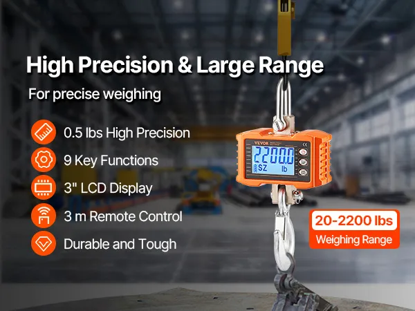 Precizie în care poți avea încredere: Pune două sticle de apă sau un hipopotam mare pe el, iar cântarul nostru de macara nu va clipi! Cu un interval fabulos între 9 kg și 1000 kg, vei obține o citire foarte precisă, doar cu o marjă de eroare de doar 0,5 lb. Pun pariu că îți va plăcea mai mult decât cele obișnuite!
