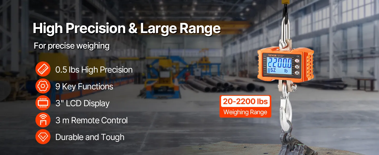 Cântar digital cu macara VEVOR, 2200 lbs/1000 kg, cântar industrial suspendat rezistent cu telecomandă, carcasă din aluminiu turnat și ecran LCD, precizie ridicată pentru construcții, fabrică, fermă, vânătoare (portocaliu)